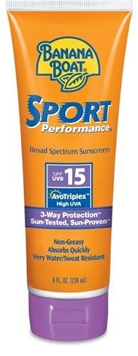 Banana Boat½ Sport Sunblock Lotion SPF 15 is sweatproof, so it won't block perspiration and continues to protect your skin.ß It provides UVA and UVB protection and is rub proof and waterproof.ß This formula is hypoallergenic, non-comedogenic (won't clog pores), non-irritating, non-greasy and 100% fragrance free.